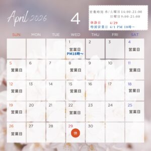 電話でのご予約はつながらない場合もありますので、ご了承下さい。080ー5214ー2895Office hours 9:00 - 19:00