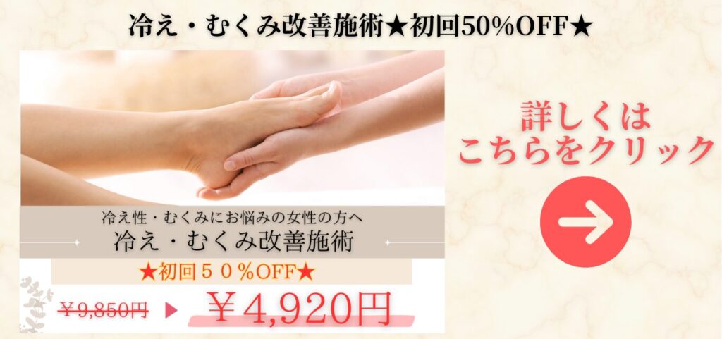①《鍼灸施術・通電療法》では、ツボを刺激しエンドルフィンを分泌。自律神経・ホルモンバランスを整え血流を促進して冷え・むくみの根本にアプローチします。